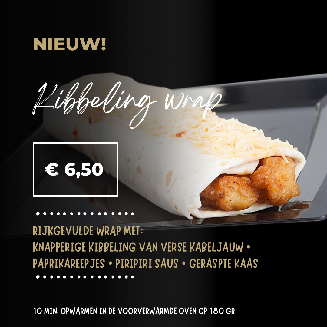 Rijkgevulde wrap met knapperige versgebakken kibbeling van kabeljauw, paprikareepjes, piripiri saus en geraspte kaas